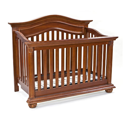 Elegant and traditional with fluted posts and carved feet, this 4‑in‑1 crib grows with your child and scored “excellent” construction in safety tests.